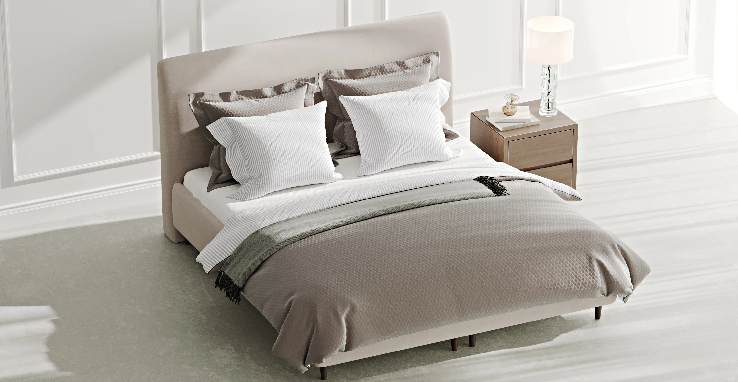 Işık Haslığı: 4 (5 üzerinden)Döşemeli Modüller Karyolanın döşemeli modülleri, yüksek yoğunluklu endüstriyel panel üzerine yerleştirilen şekillendirilmiş destek katmanlarıyla form kazandırılarak üretilmiştir. Dış yüzeyde kullanılan kuş tüyü sünger, bu modüllere hem yumuşak bir dokunuş hem de uzun ömürlü bir konfor kazandırır. Başlık Başlık kısmında yine aynı katmanlı yapı tercih edilmiştir. Taşıyıcı panel üzerine yüksek yoğunluklu şekillendirilmiş destek malzemeleri ve en üstte kuş tüyü sünger bulunur. Böylece başlığa yaslandığında, koltuk minderini andıran yumuşak ve destekleyici bir hissiyatla karşılaşırsın. Kitap okurken, ekrana bakarken ya da dinlenirken sırtını konforlu bir şekilde destekler. İskelet Karyola gövdesi, özel büküm ve kaynak teknolojisiyle üretilmiş dayanıklı metal konstrüksiyona sahiptir. Üst ve alt yüzeylerde kullanılan 8 mm MDFlam’dan üretilmiş delikli panel sistemi sayesinde yatak ve baza arasında düzenli hava sirkülasyonu sağlanır. Delikli panel sistemi, bazanın iç kısmında kötü koku ve nem oluşumunu önlerken yatağın da nefes almasına yardımcı olur. Mekanizma Baza açılışında kullanılan 750 newton kuvvete sahip yüksek taşıma kapasiteli amortisörler, kapağın kolay ve kontrollü bir şekilde açılıp kapanmasını sağlar. Ekstra güvenlik için eklenen kilit sistemi de, kapağın açık konumda sabit kalmasına yardımcı olur. Böylece günlük kullanımda hem rahat hem de güvenli bir deneyim sunar. Ayaklar Masif kayın ağacından üretilmektedir. Ayrıca kayının doğal rengi nedeniyle her ürün eşsizdir, ton farkı görülebilir. -