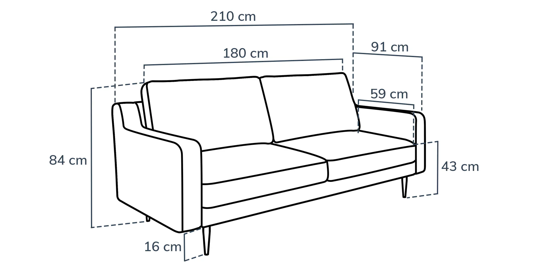 Genişlik 210 cm Derinlik 91 cm Yükseklik 84 cm Oturum Genişliği 180 cm Oturum Derinliği 59 cm Oturum Yüksekliği 43 cm Ayak Yüksekliği 16cm -